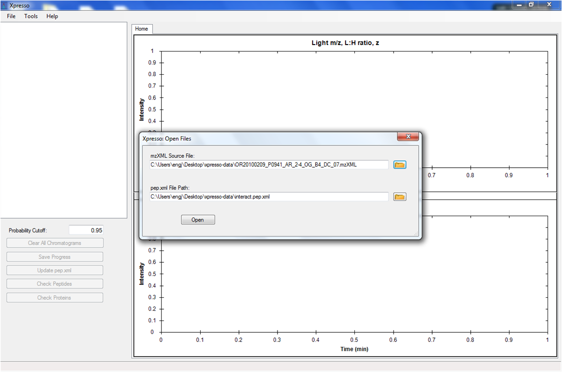 Input files to XPRESSO are pepXML and mzXML files analyzed through the TPP pipeline. An interact.pep.xml file contains one or more LC-MS/MS runs that have been sequence database searched and then analyzed by XPRESS. This file and the corresponding mzXML files are the inputs to XPRESSO.
