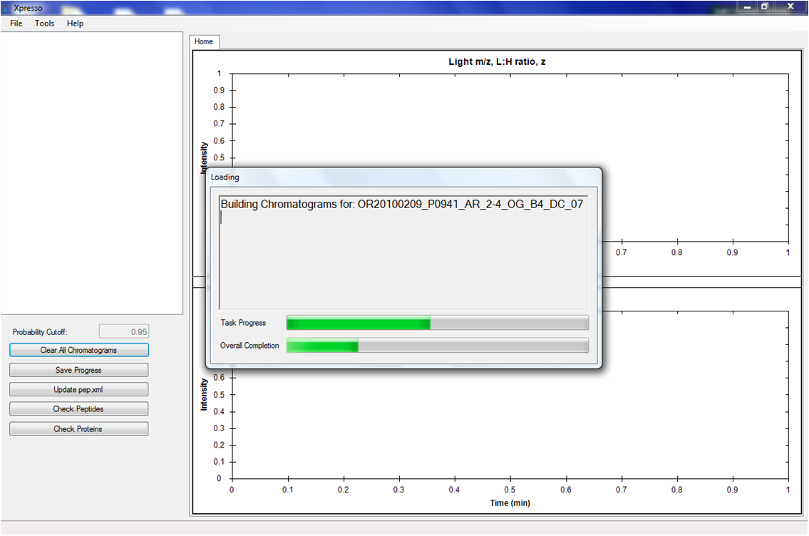 After files are selected and the "Open" button is pushed, XPRESSO will generate chromatograms for the data. Although this process has been optimized, it could take upwards of tens of minutes if you have a large dataset with many input files.