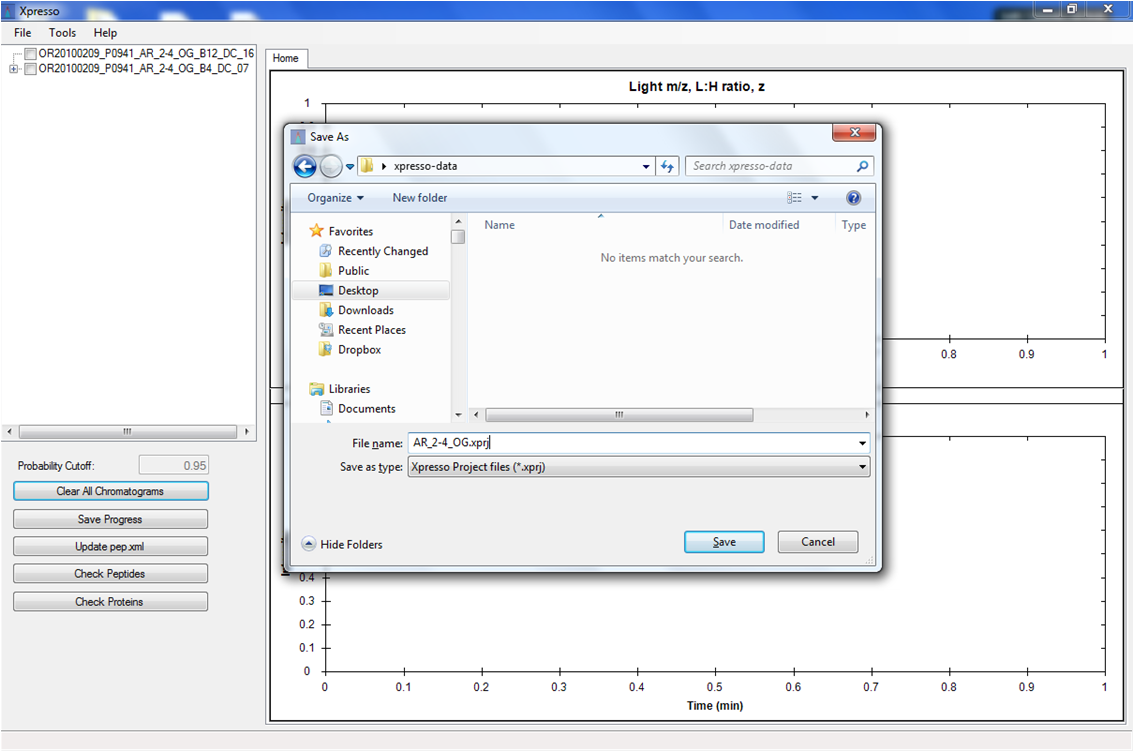 Once files are loaded, you will be prompted to save an XPRESSO project file. This project file stores all information associated with an XPRESS project including the underlying extracted chromatograms, edited/validate/rejected entries, etc. These results are stored in an intermediate format (sqlite). This allows one to save progress and come back to the data at a later date to resume analysis. Once all analysis are complete, you will update the corresponding pep.xml file. Until that happens, the XPRESSO project file is where all data are saved. So give your project file a unique name and save it in a convenient location.