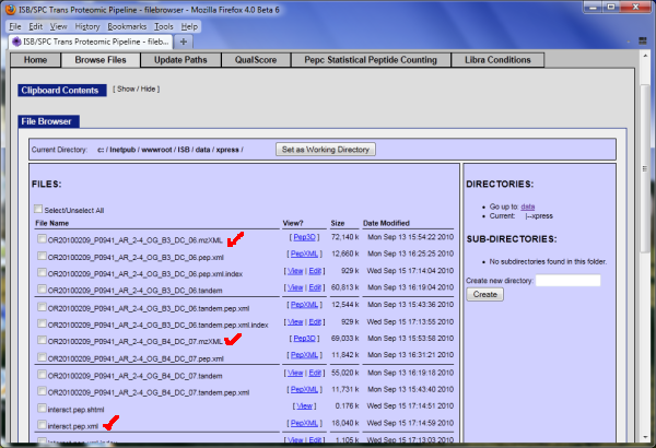 two Orbitrap runs were searched using X!Tandem, converted to pepXML, and analyzed through the TPP pipeline. The resulting files are listed in the TPP file browser. To state the obvious, please make sure you run XPRESS as XPRESSO curates quantitative results by reading the XPRESS elements in the pepXML file. By convention, files processed through the TPP have the name "interact*.pep.xml" for peptide/spectrum level results and "interact*.prot.xml" for protein level results. The files marked with a red checkbox (two mzXML and interact.pep.xml) are the input files necessary for XPRESSO.